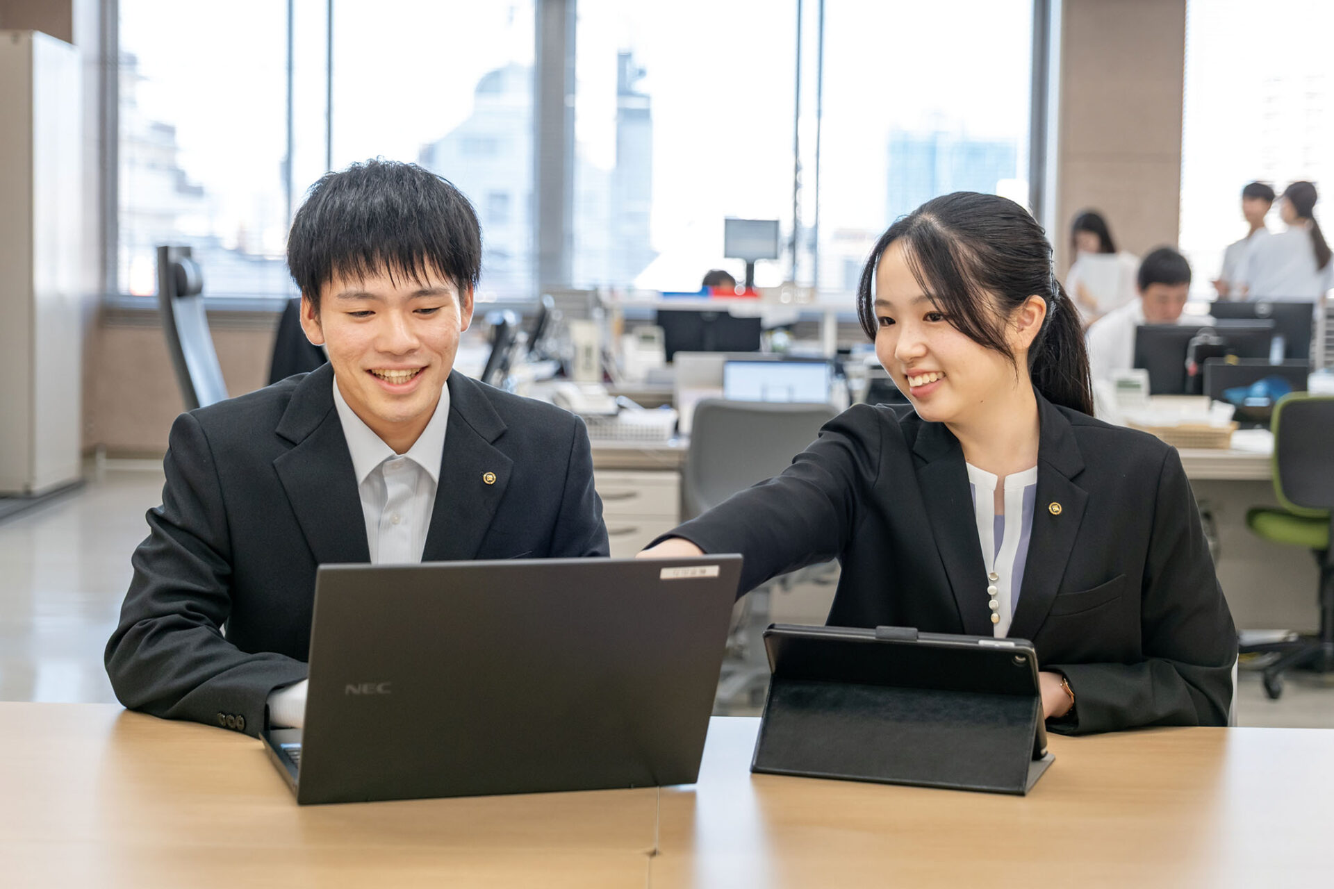1つ目は人材育成制度が充実していること。研修や資格取得のサポートが手厚く、成長を後押ししてくれます。2つ目は一緒に働く「人」。公私ともに相談できる頼れる仲間がたくさんいます。